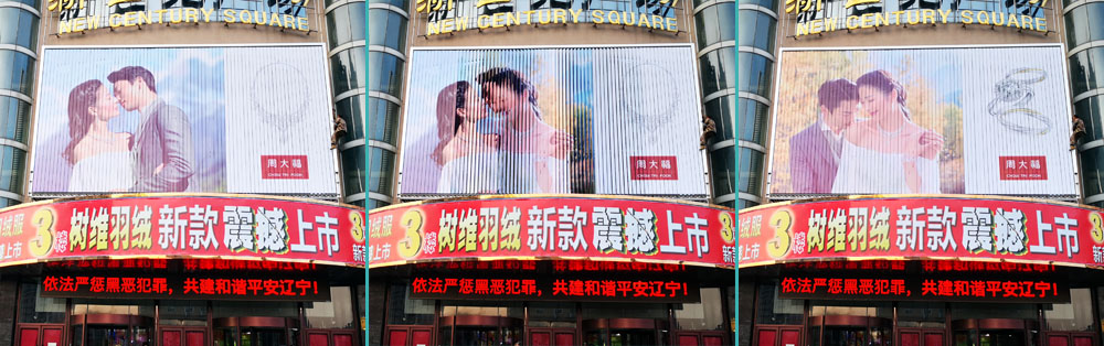 三面翻廣告牌安裝于墻體時(shí),通常需要制作簡易箱體結(jié)構(gòu)。箱體厚度(三翻轉(zhuǎn)廣告牌距離墻體的距離)大于50cm。如果樓體有大理石或鋁板、鋁塑板外裝的,一般可以利用原有結(jié)構(gòu)進(jìn)行安裝。三面翻廣告機(jī)安裝位置低矮的,也可以使用腳手架或吊籃等進(jìn)行貼墻安裝,廣告牌距離墻體僅有5cm,經(jīng)濟(jì)美觀。廣告牌后方有窗戶時(shí),一定要做遮光處理,以免夜間光線透過三面翻三角型材縫隙,造成畫面分割,影響廣告效果。三面翻報(bào)價(jià)不包含此項(xiàng)。三面翻廣告牌的畫面制作、粘貼、更換